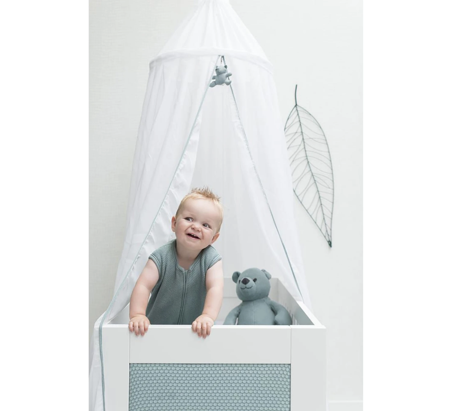 Let op: Om te voorkomen dat je kindje verstrikt raakt en zich bezeert, verwijder deze klamboe wanneer je kindje op handen en voeten begint te kruipen.