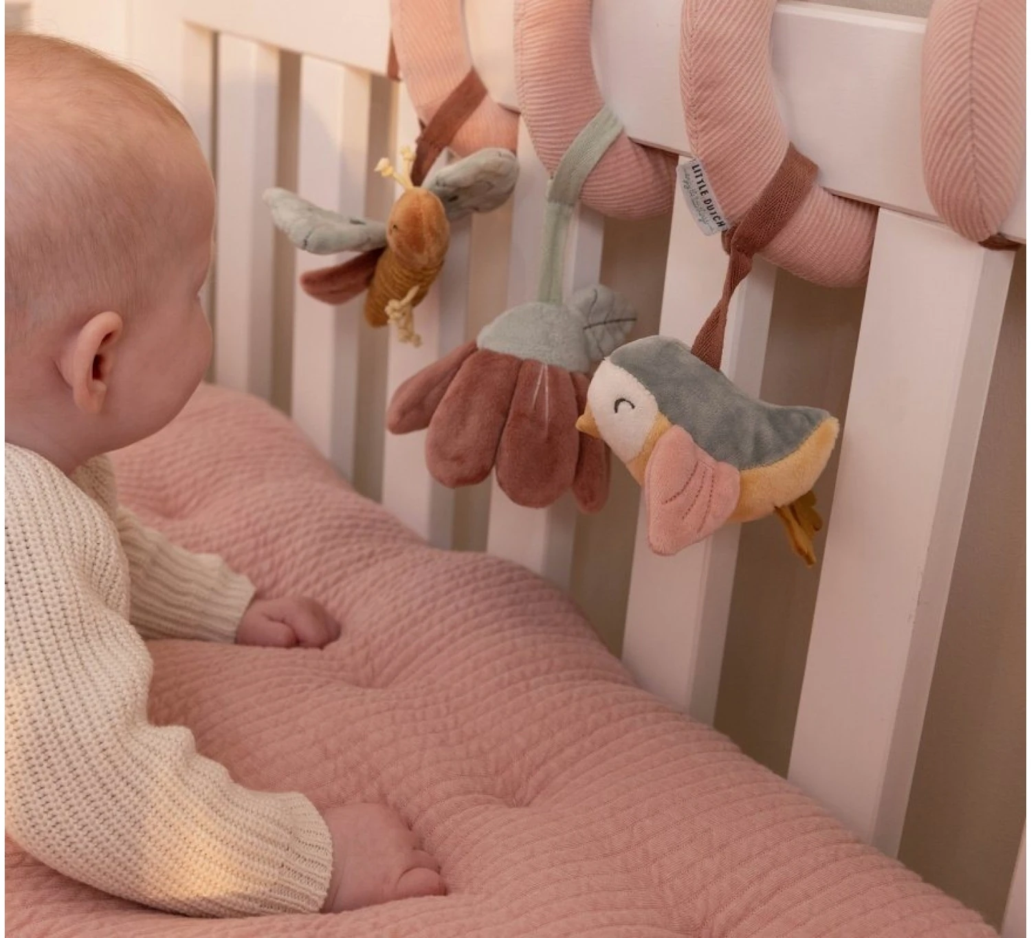 De boxspiraal is makkelijk te bevestigen aan een box, bedje of de beugel van de kinderwagen. De activiteitenspiraal is gemaakt van corduroy met katoen en draait om een klein vogeltje, een kleurrijke vlinder en een fascinerende bloem die een ratelend geluid maakt.