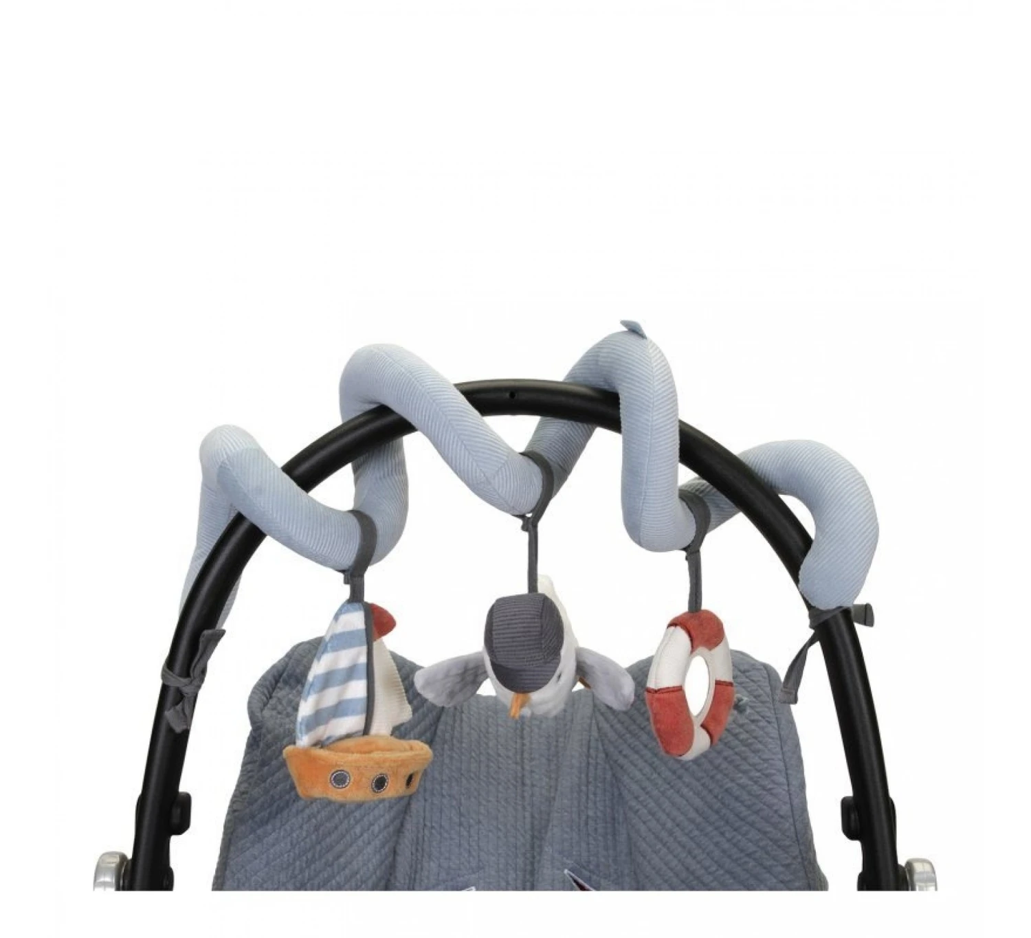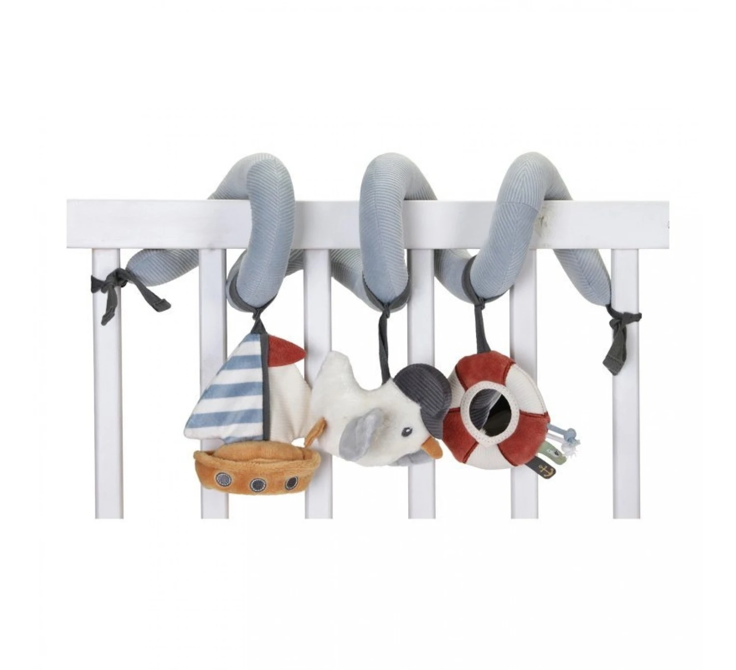 De boxspiraal is makkelijk te bevestigen aan een box, bedje of de beugel van de kinderwagen. De activiteitenspiraal is gemaakt van corduroy met katoen en heeft verschillende speeltjes, waaronder een zeemeeuw, een zeilboot en een reddingsboei met verschillende leuke labels en een spiegeltje voor zelfontdekking.