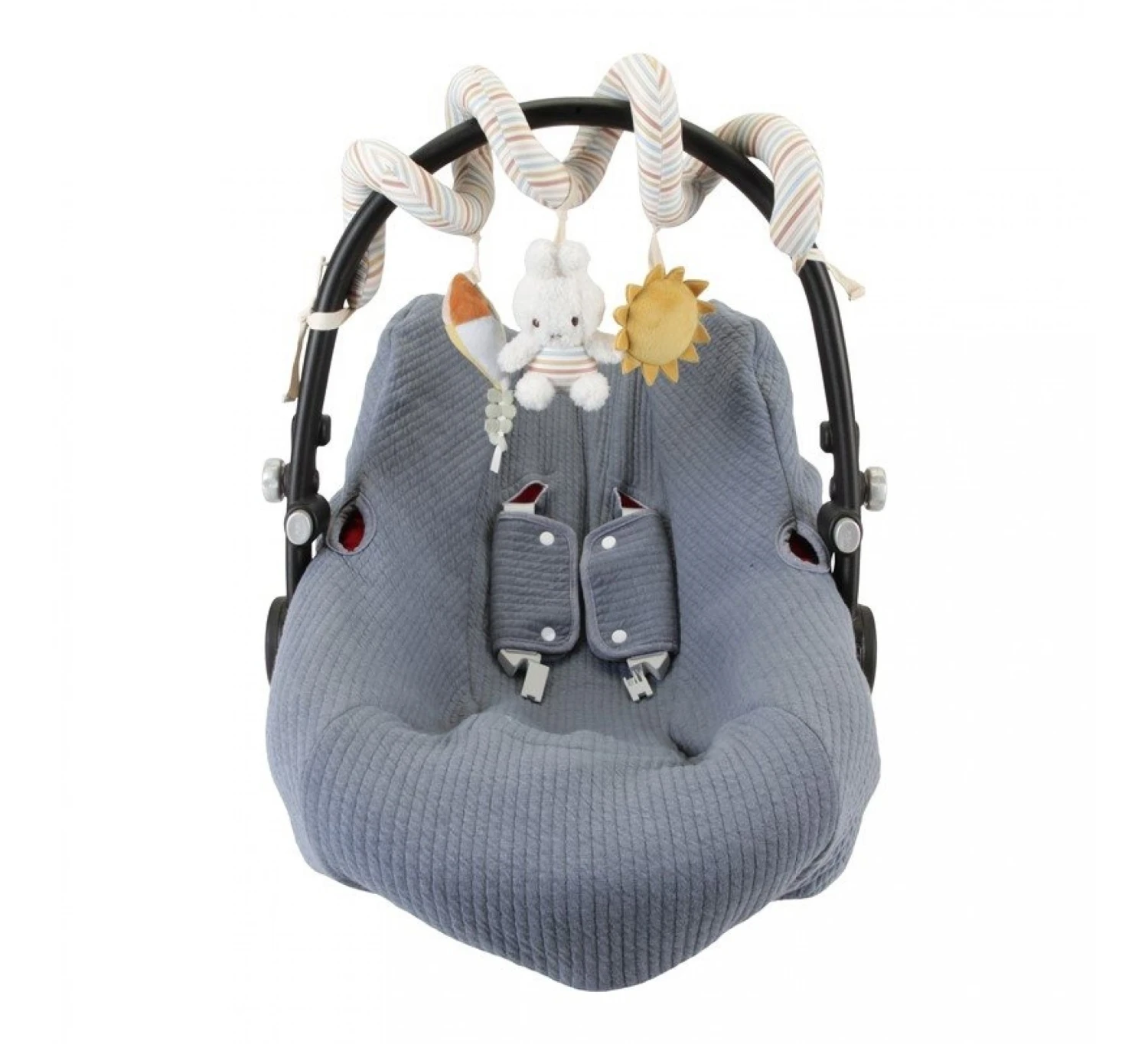Probeer nijntje maar te pakken! Deze wagenspanner is niet alleen mooi om naar te kijken als je onderweg bent, hij nodigt ook uit om te spelen. nijntje en de vlieger en zon uit de Vintage Sunny Stripes-collectie van Little Dutch hebben elk een functie om te ontdekken. Vind het ratelende geluid, het piepen en knisperen! Bevestig de wagenspanner gemakkelijk aan het autostoeltje of de kinderwagen en je kleintje zal zich vermaken als jullie onderweg zijn. Ook goed voor de hand-oogcoördinatie!