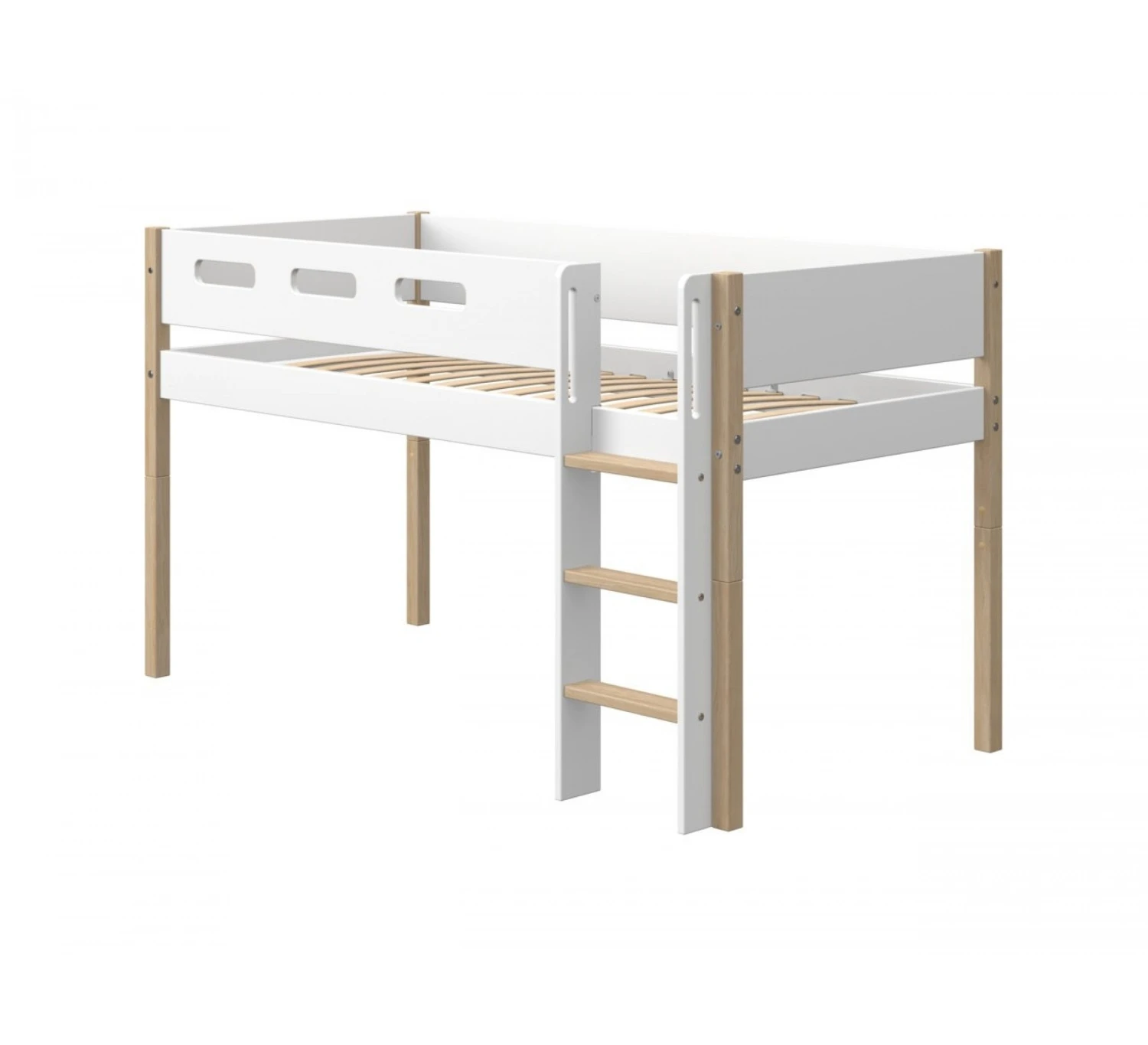 De Nor halfhoogslaper is voorzien van een rechte ladder en uitvalbeveiliging voor kinderen. De ladder heeft anti-sliptreden en geïntegreerde handgrepen en kan aan beide uiteinden van het bed geplaatst worden. De ruimte onder de halfhoogslaper is geschikt als opbergruimte en kan gecombineerd worden met opbergoplossingen uit de collecties Popsicle en Cabby. Met het textiel van Flexa kun je een privéplekje onder het bed creëren door een speelgordijn toe te voegen. De nishut kan op het bed gebruikt worden. Door een uitvalbeveiliging en glijbaan toe te voegen aan het bed verander je de kinderkamer in een waar speelparadijs. De Nor-collectie groeit met kinderen mee. Met korte poten verander je de hoogslaper in een eenpersoonsbed en met hogere poten maak je er een hoogslaper van. Het bed is gemaakt van hoogwaardig MDF en heeft poten van massief eikenhout.